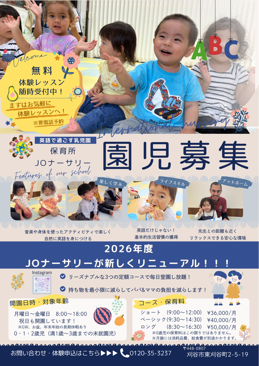 3 032026 JOナーサリー2026年度園児募集中!! 英語は習得してほしいけど英会話では効果が出るか不安… だけどインターナショナルスクールは値段もハードルも高い… そんなパパママのお悩みを解決するために、 2026年4月、JOナーサリーがリニューアルします★ たくさんのお問合せをお待ちしています♪ 【2025年10月開講年少々クラス園児募集中!!!】 前の記事